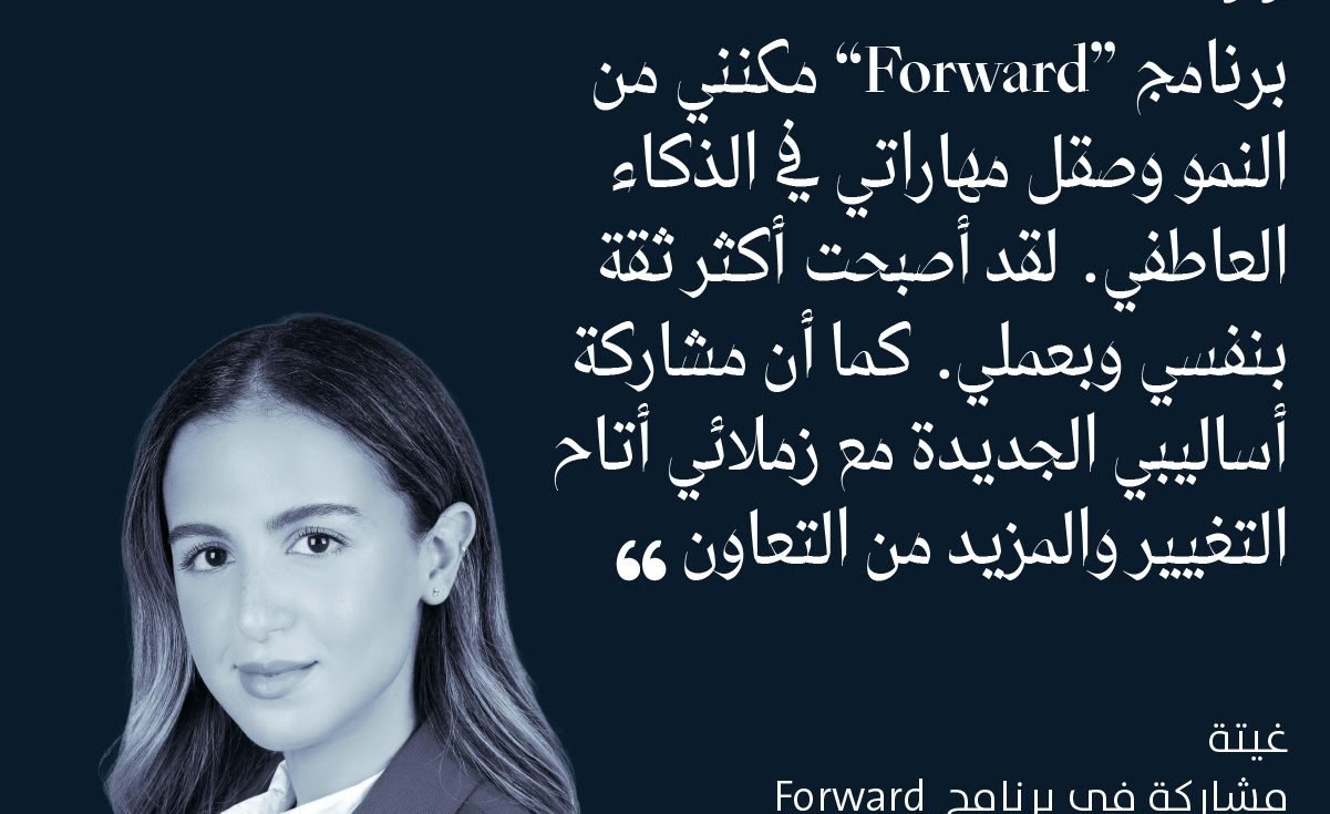 • تم تصميم برنامج “فورورد” لرصد الاحتياجات من مصادرها وتمكين الجيل القادم من المواهب بالمهارات الضرورية الأكثر طلباً في بيئات العمل حاضراً ومستقبلاً، بما في ذلك التكيف والمرونة، وابتكار الحلول، والمهارات الاجتماعية، والذكاء العاطفي، والطرق الجديدة للعمل والتفكير في عالم رقمي متسارع.
