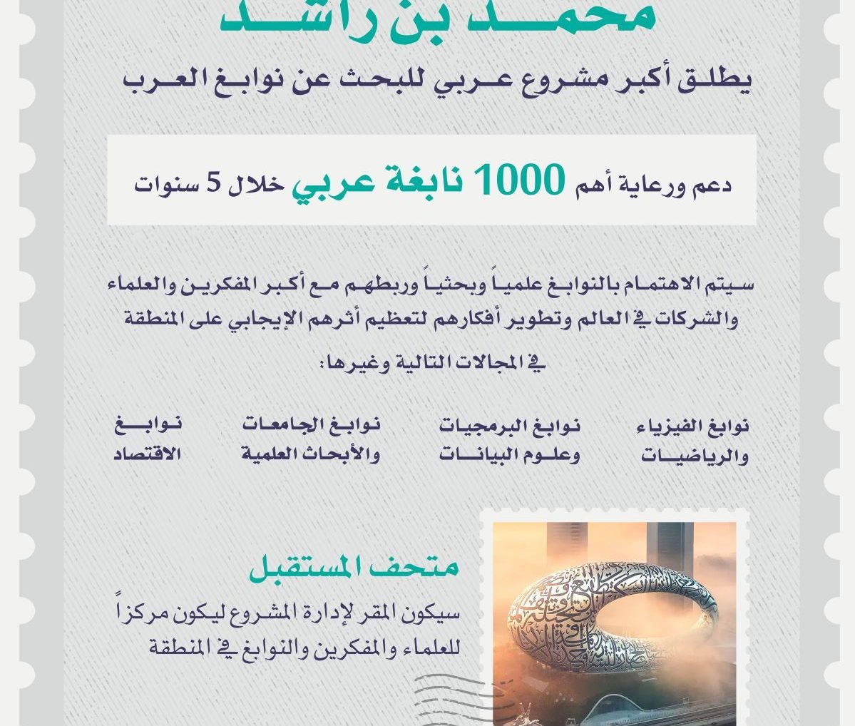 أطلق الشيخ محمد بن راشد آل مكتوم نائب رئيس دولة الإمارات رئيس مجلس الوزراء حاكم دبي، مبادرة “نوابغ العرب”، يقوده متحف المستقبل، للإشراف على المواهب والمبدعين العرب، بميزانية تتجاوز 100 مليون درهم.