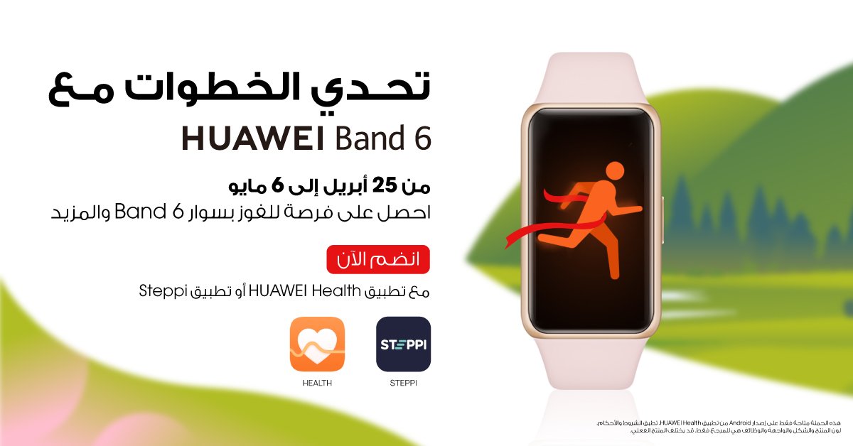 أطلقت هواوي تحدٍ للياقة البدنية في دولة الأمارات،ابتداءً من 25 أبريل إلى 6 مايو، تتيح الفوز بسوار HUAWEI Band 6 الجديد وقسيمة متجر هواوي – HUAWEI Store Voucher بقيمة 20 درهمًا إماراتيًا.