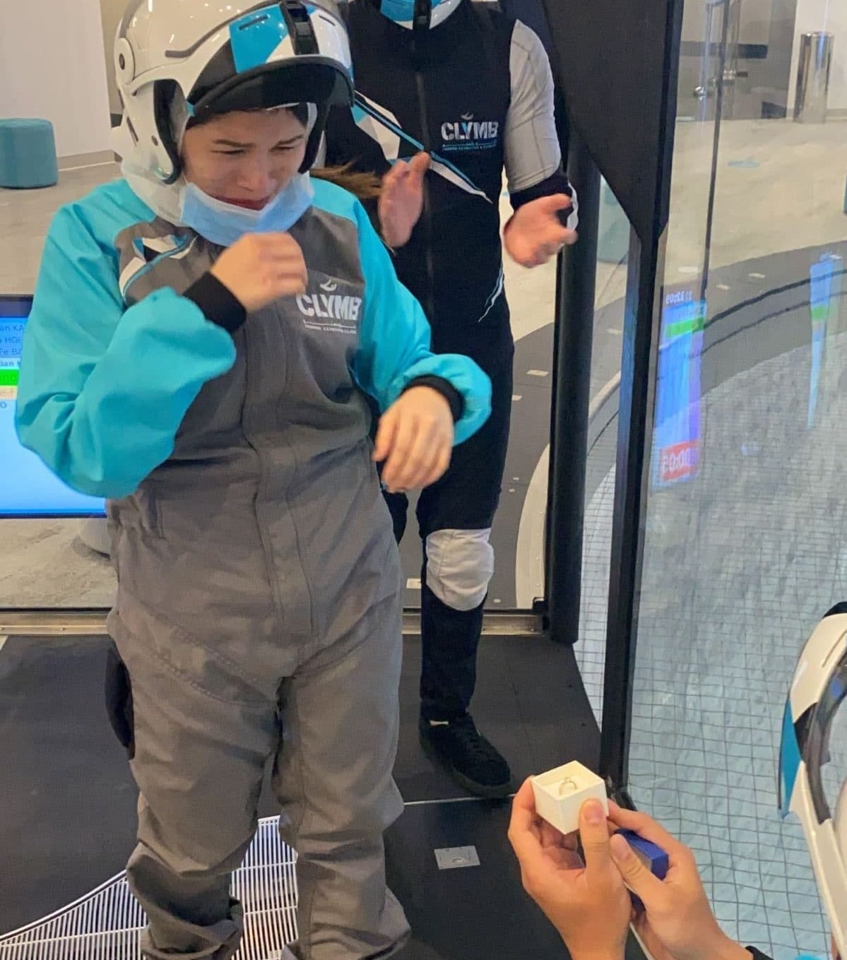 خلال التحليق في النفق حمل الشاب الزائر، لافتة تسأل رفيقته الزواج به أثناء تحليقها داخل النفق الهوائي، وساعده على تقديم عرضه فريق “كلايم أبوظبي” حيث حرص الفريق على أن تتواجد ضيفتهم في نقطة يمكن منها قراءة لافتة طلب الزواج بوضوح، لتجيب الضيفة الزائرة بالموافقة، وسط تهاني الفريق لعروسي المستقبل.