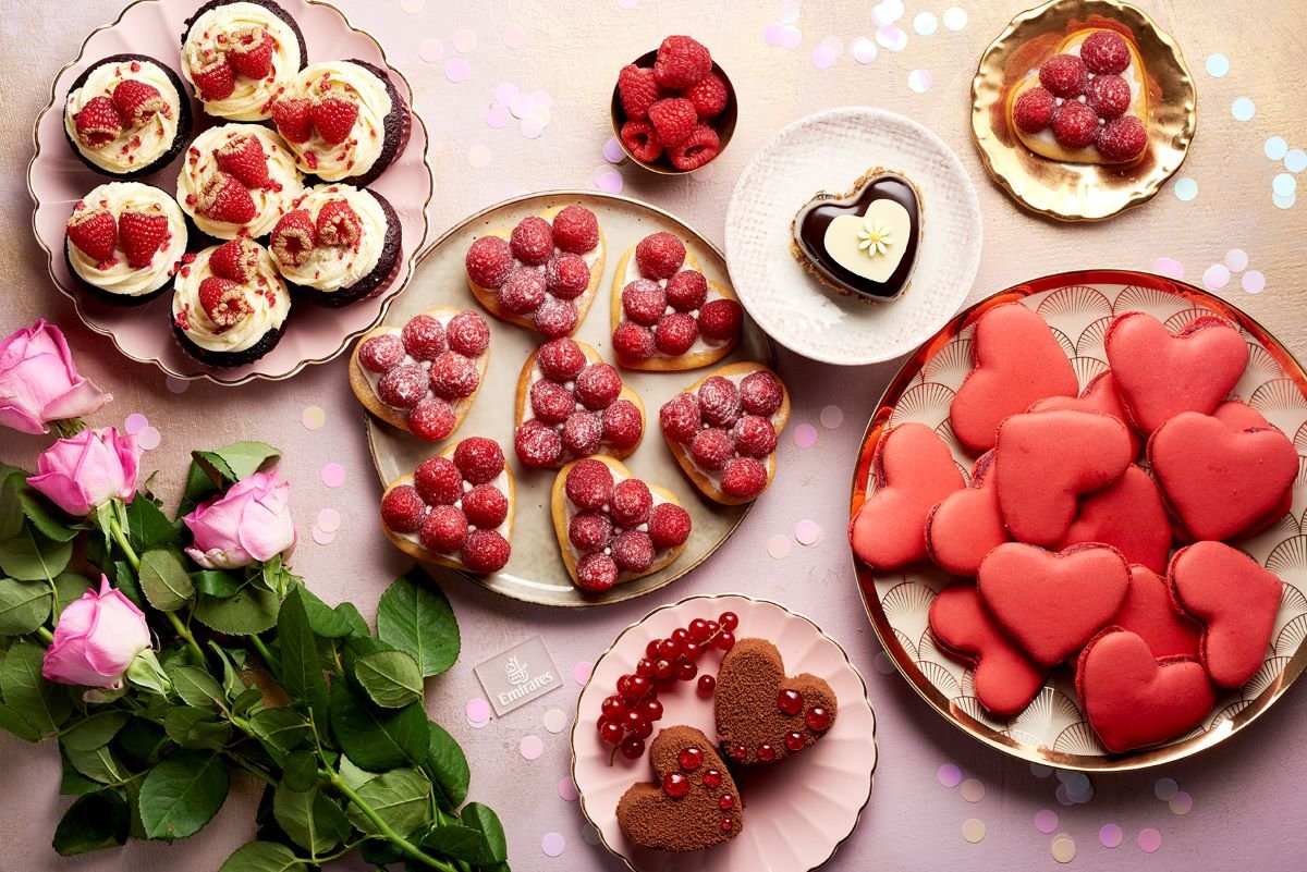 وفي الصالات الخاصة، يستمتع مسافرو الدرجتين الأولى والأعمال وأعضاء “سكاي واردز طيران الإمارات” المؤهلين، بتشكيلة من الحلويات المستوحاة من يوم الحب مثل الشوكولاتة والكعك على شكل قلب، والفراولة المغطاة بالشوكولاتة مع جوز الهند، والزنجبيل البرتقالي، وحلوى “بانا كوتا” مع التوت والفستق الحلبي.